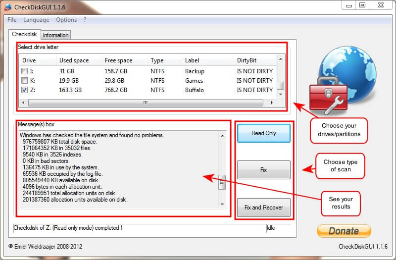The Fix option will Read the drives/partitions you have chosen and if problems are detected CheckDiskGUI will attempt to repair them. It must be noted here that if any files and/or programs are in use on a problem drive a re-boot of your computer may be necessary to complete the repairs.