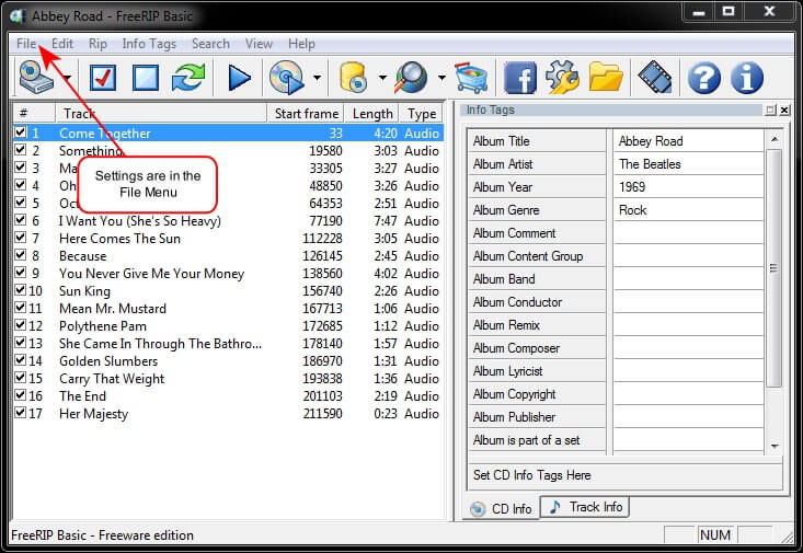 To get to the Settings Menu in FreeRIP, click the File Menu indicated in the above image. Then you’ll see this:
