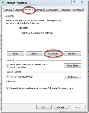 Now, be sure the Privacy Tab is chosen, then click the Advanced Button. You should now be here: