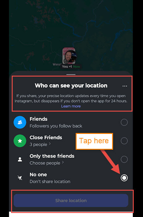 Who can see your location: If you share, your precise location updates every time you open Instagram, but disappears if you don’t open the app for 24 hours.