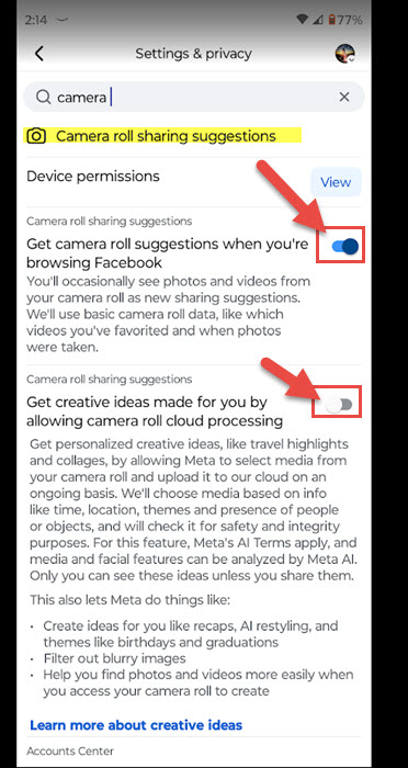These two you will want to turn off by tapping the switch to the right of that option. This should keep Facebook from accessing your camera roll when you are not in it. It is important to take steps like this to keep apps from having too much access to your information. Done.