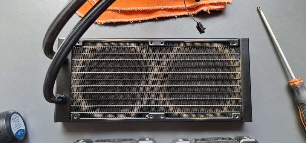 In spite of the fact that this case has three very effective dust filters and with the front being a huge dust filter, it’s surprising how much dust gets in. My setup is two 120mm front fans pulling air in, two 120mm pulling air in through the top radiator, and one 120mm exhaust fan at the rear. It’s very effective, but over the years, the dust really builds up, as you can see from the AIO radiator.