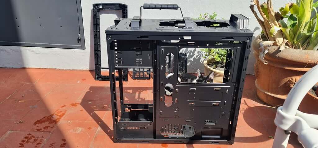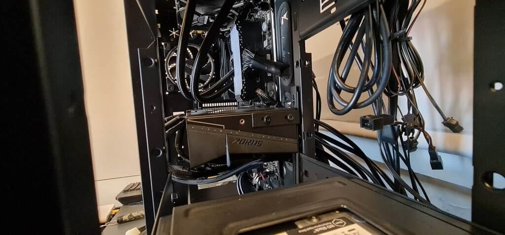 Fortunately, the case is a modular design with two HDD cages that can be inserted side or front with the option of adding a 120mm cooling fan to each. However, the case was designed with DVD drives and HDDs in mind, hence the two vertical pillars. In the end, I simply moved the cages around and left out a bracket that would otherwise prevent the tall GPU support bracket from being fixed to the back side of the case. I also removed the useless plastic tool tray from the bottom of the case, so that the foot of the support could rest at the bottom. Job done!