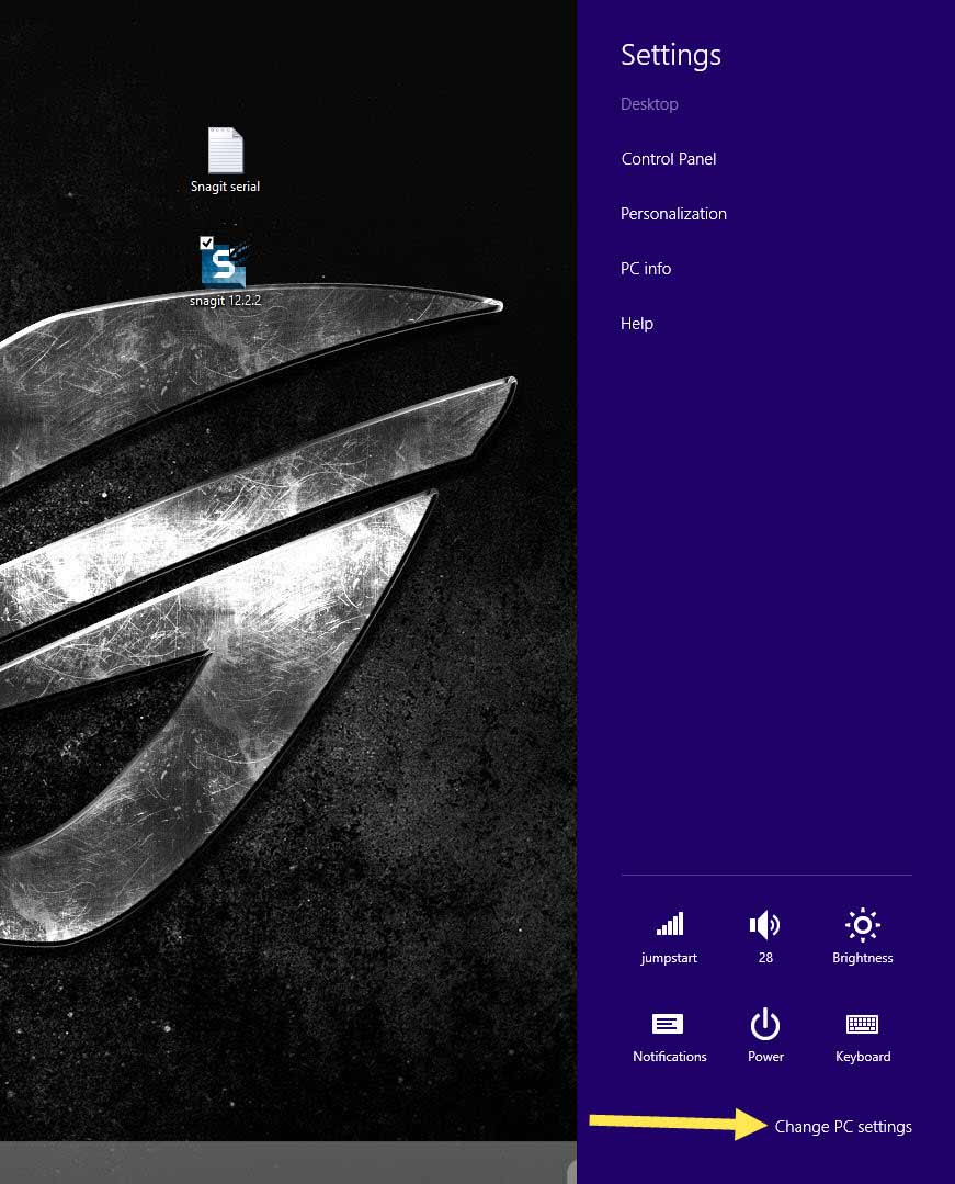 Now a larger side bar will show up. At the bottom of this you will find the link “Change PC Settings.” Click it.