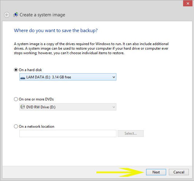 - This screen is where you will need to decide where you want to save your back up image. They give you 3 options to choose from (Hard Disk, DVD or on a network location). Choose the one with the most space. You will understand when you see the next steps. I suggest using an external hard drive. Once you have chosen the location Click “NEXT”.