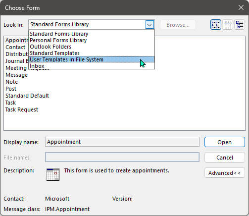 2. Select More Items > Choose Form. This will open a window showing several locations where your template could be located.