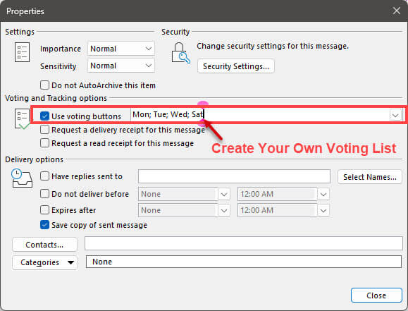 4. Custom – Clicking on Custom will open the Properties window where you may create a custom vote by adding any items separated by a semicolon.create-your-own-voting-list