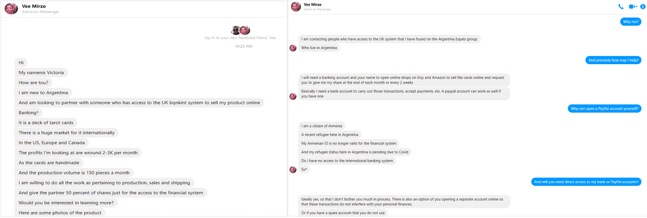 In fact, and by sheer coincidence, I’m conversing with a potential scammer on Facebook messenger as I write this article, so I thought I would string her along with a few well-directed questions.