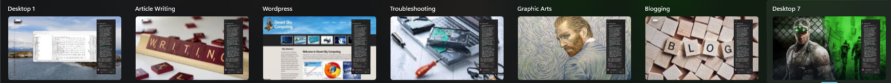 Instead of trying to juggle the different tasks I might perform, I can leave them open on a dedicated desktop and simply jump from one to another without the need to close windows. The example I use for myself is much more than you might need but is made to show you the versatility available.
