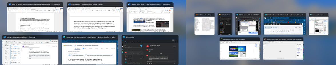 I have become so dependent on multiple windows to be productive that I find it difficult to close any. Being able to add additional monitors to your system does make managing several windows easier. Using Task View in the Taskbar or [ALT]+[TAB] will display all open windows on all monitors.