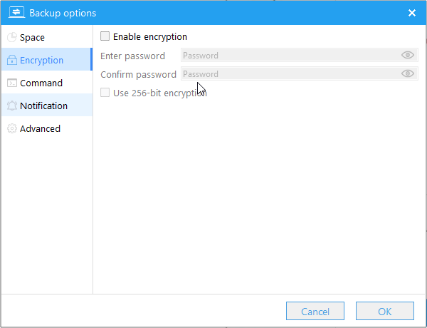 Hasleo can encrypt the backup image file. Hasleo Backup Suite uses the AES (Advanced Encryption Standard) encryption algorithm to encrypt the backup image files. The minimum length of the password is 6 and the maximum length is 64. The normal key size is 128-bit, but Hasleo has the option to use a 256-bit key size. Aomei also uses an AES cryptographic algorithm to encrypt images, but I do not know what their key size is.