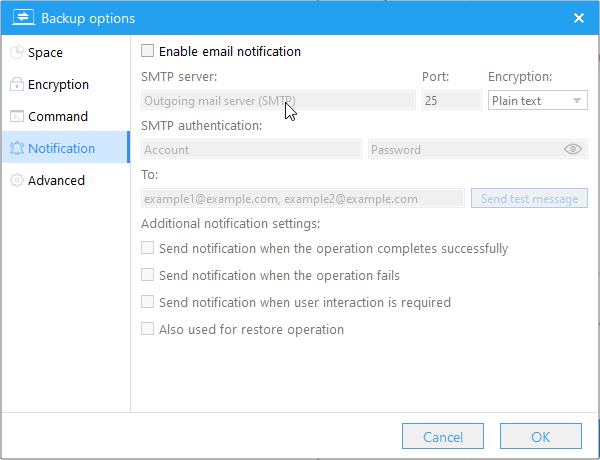 Hasleo can send email notifying the execution status of the backup task, i.e., the task is successful, failed, or human intervention is required. Note that when in the WinPE recovery environment, this feature may not work because a network is usually not configured in the WinPE environment.