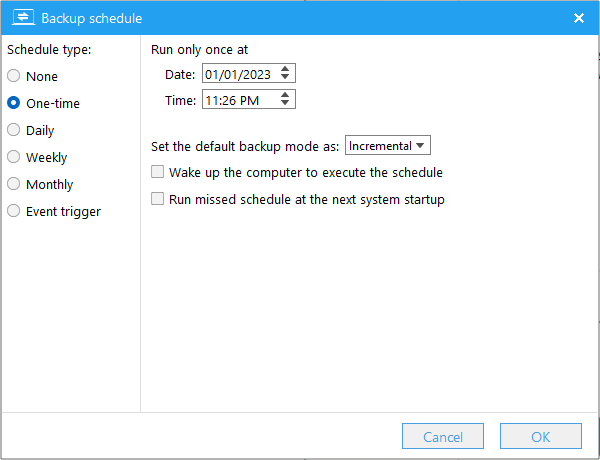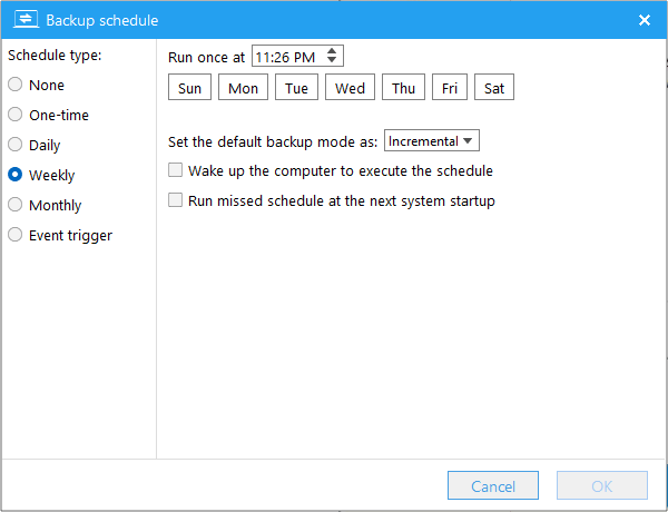 Different types of backups (Full, Incremental, or Differential) can be scheduled to take place on a daily, weekly, monthly, or even based on an event. One interesting event trigger is USB drive is plugged in. If your target disk is a USB device, the defined operation will not occur until that device is seen through the event. This allows a task to be set up to image your system on an external USB device and automatically do an update each time that USB device is plugged into the system with a once-a-day limit option. A convenient and useful way to back up the system if you are using an external device.
