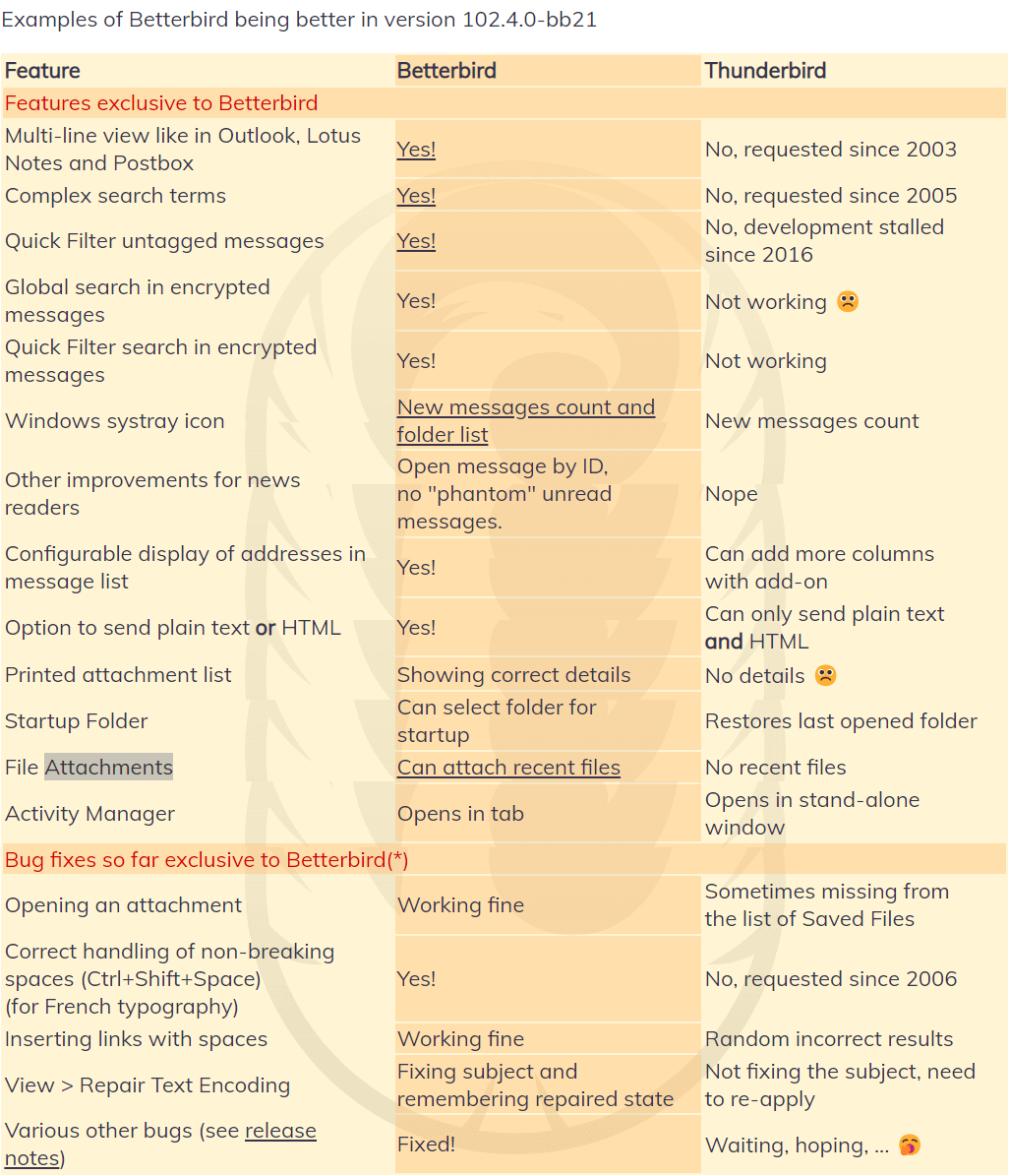 Betterbird offers a list of feature enhancements compared to Thunderbird which can be seen in the following table: