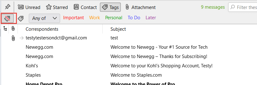 - Quick Filter Untagged Messages. In the Quick Filter widget, turn on tags by selecting the Tags icon