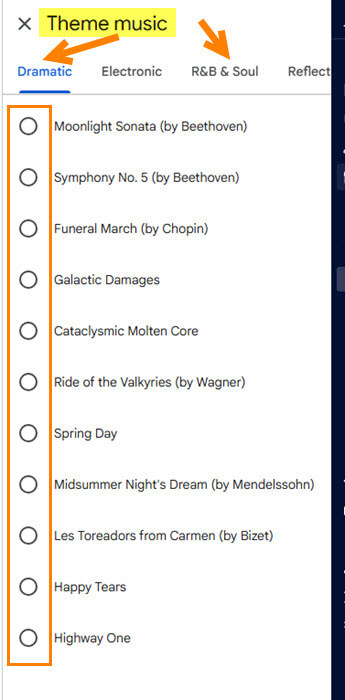 Step 8: This will give you options for Theme Music you can add to your Highlight video. They have a few categories to choose from. Click the circle to select one. Then you can preview your video to see if you like it. If you are happy, click on Save at the top.