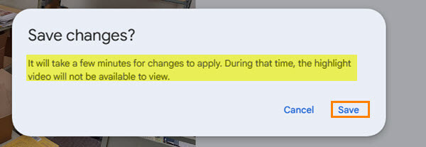 Save Changes? It will take a few minutes for the changes to apply. During that time, the highlight video will not be available to view.