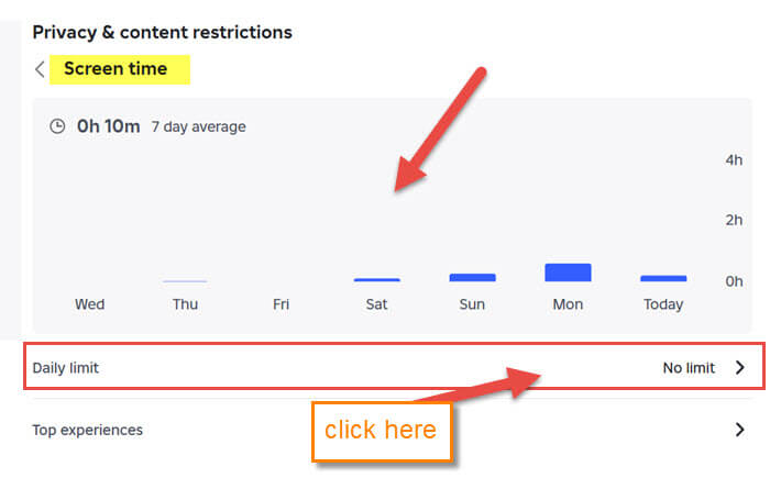 Step 6: The Daily Limit window will appear, and as before, tap the down arrow on the box. You can choose the time here and tap save. If you want to see the time you have spent on each game you played this week, tap on Top Experience option. DONE!