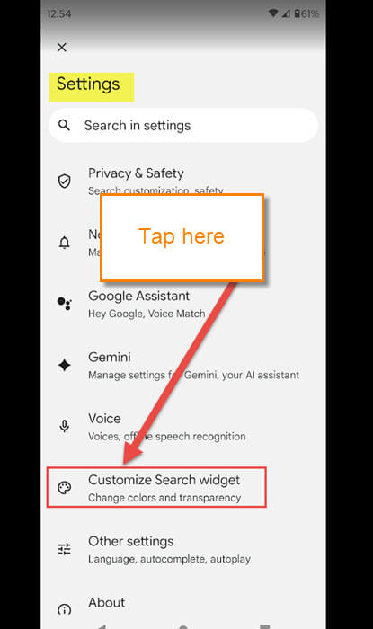 Step 4: On the Settings menu, look for Customize Search widget. Tap it.