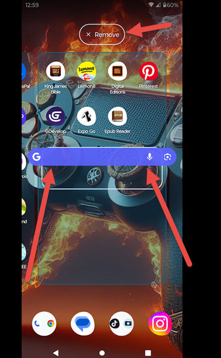 Step 9: You will be taken to the Home Screen to place your Search Widget. You can drag it to the place you want and resize it too. Drop it, and you are all good to go.  You can tap the remove option at the top if you change your mind. DONE!