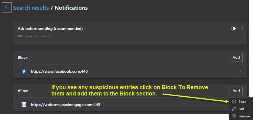 - Click on the ellipsis (3 dots) at the right of the entry, choose Block to have it removed, and add them to the Block section