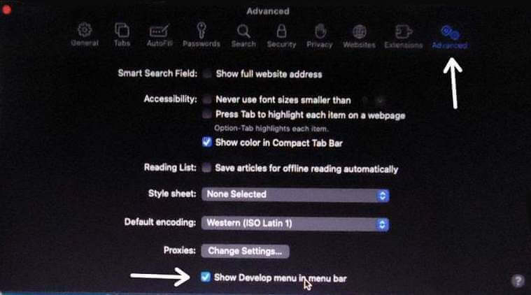 In the window that opens, click on the last icon called Advanced. Down at the bottom of that window check the little box before Show Develop menu in menu bar.