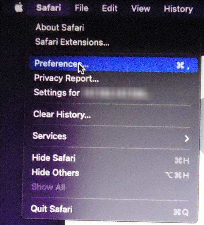 Now you need to enable the develop menu bar if not already done. Click on Safari in the top left-hand corner right after the Apple symbol. Then click on Preferences.