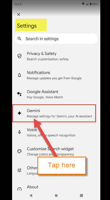 Step 4: The Settings menu will appear, and we are looking for the Gemini option. Tap it.