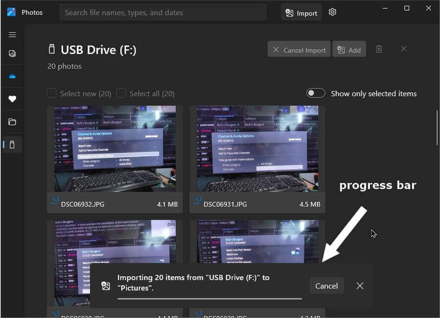 Now, click on “Import”. Wait a few minutes, depending on the number of photos you have. You should see a progress bar at the bottom. When finished, your pictures should be in the folder you selected.