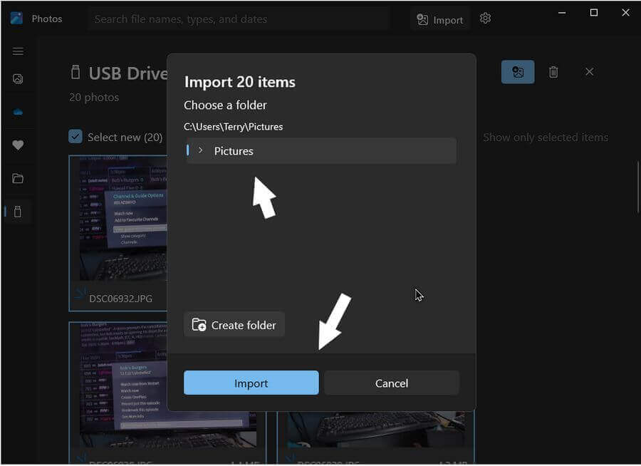 Then it will ask you to select a folder. The default is either your system Picture folder or OneDrive if you have it active.