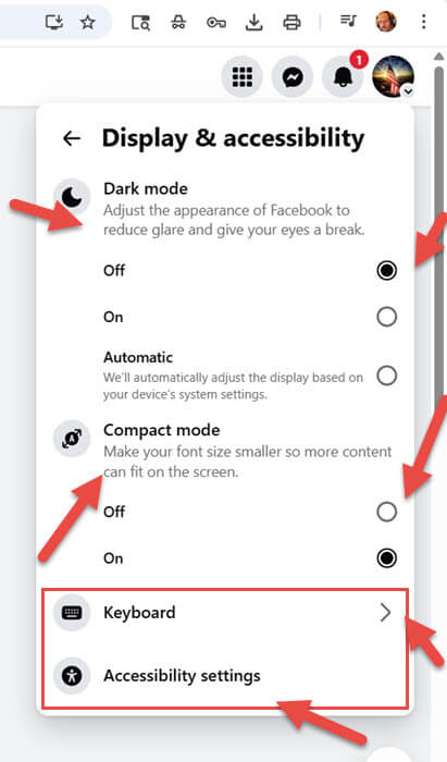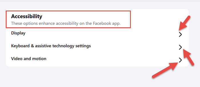Click the first option, which will show you a screen of the Facebook keyboard shortcuts. You will need to mess around in there to know what keys do. Turn it on or off. The other one on the Display menu was accessibility. Click on that one now.