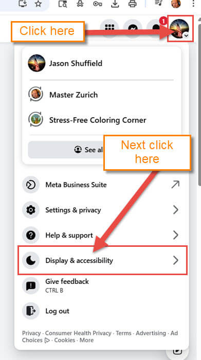Step 2: Once you are logged in, look to the top right. You will see your profile image, and you will need to click on that. A menu will appear, and you need to find the Display & accessibility option. Click it.