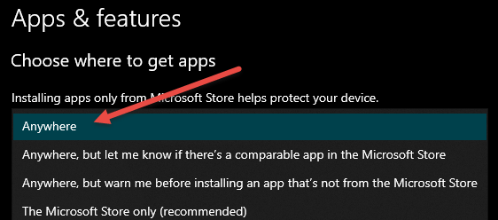 Go to Settings > Apps > App & Features. Now, at the top of the main panel you should see "Choose where to get apps". Use the dropdown menu to change that setting from "The Microsoft Store only (recommended)" to "Anywhere".