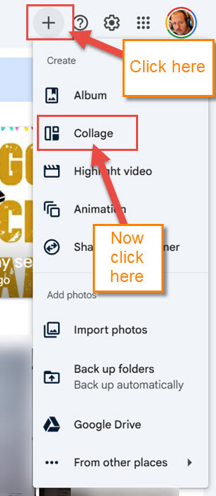 Step 4: You will now be on your Photos screen. Look to the top right for the plus sign. Click it, and a menu will drop down. On this menu, find the option called Collage. Click it.