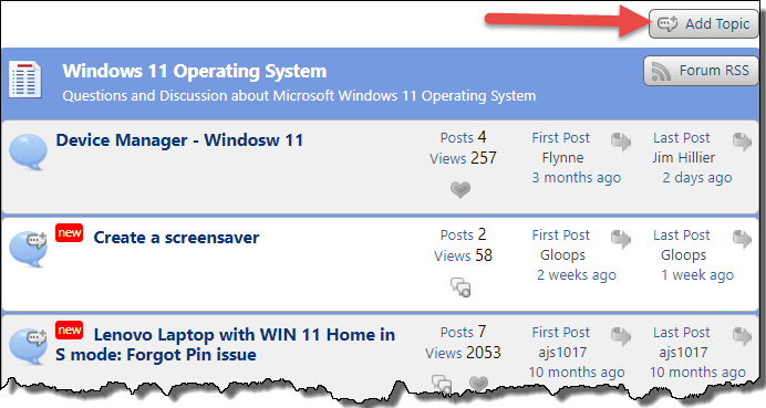 Now you'll see an Add Topic button at the top and bottom of the list of threads (see attached image)- click that button.