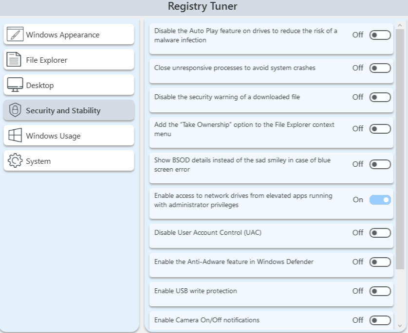 REGISTRY TUNER: Includes lots of useful registry tweaks divided into six categories. Far too many to itemize here. However, you will find plenty of interesting/useful tweaks. To give you an idea, here are some of the tweaks under the “Security and Stability” category: