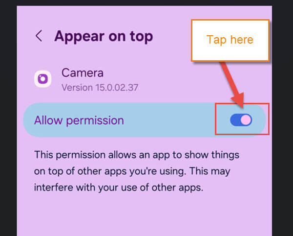 The Appear on top screen is now showing. From here, you will see Allow Permission.