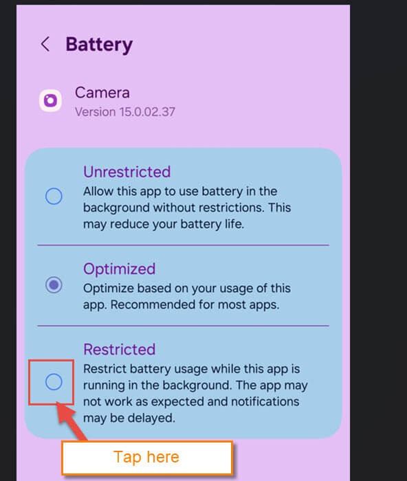 We will want to tap the circle to the left of Restricted. Tap that, and this will keep your camera from using the battery in the background when it is not necessary. We have one more thing to adjust, and that is back on the App Info screen.