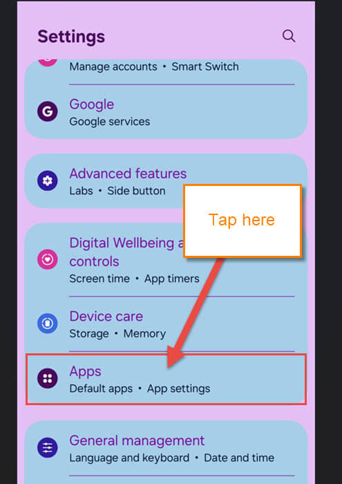 Step 2: On the Settings screen, locate the Apps option and tap it.