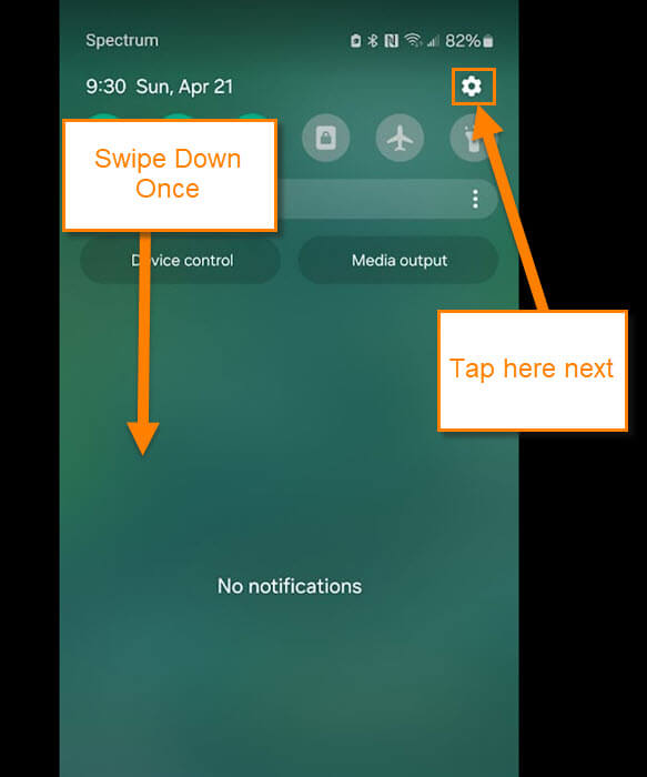 Step 1: Swipe down from the top of your phone. Find the Gear icon (Settings) and tap it.