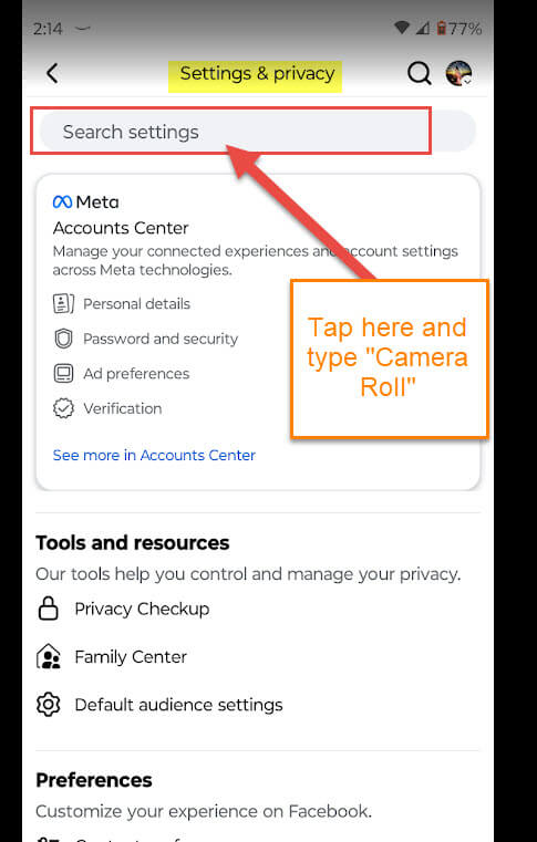 Step 5: Now that you are on the Settings menu, look for the Search Box at the top. Tap it and type in Camera roll.