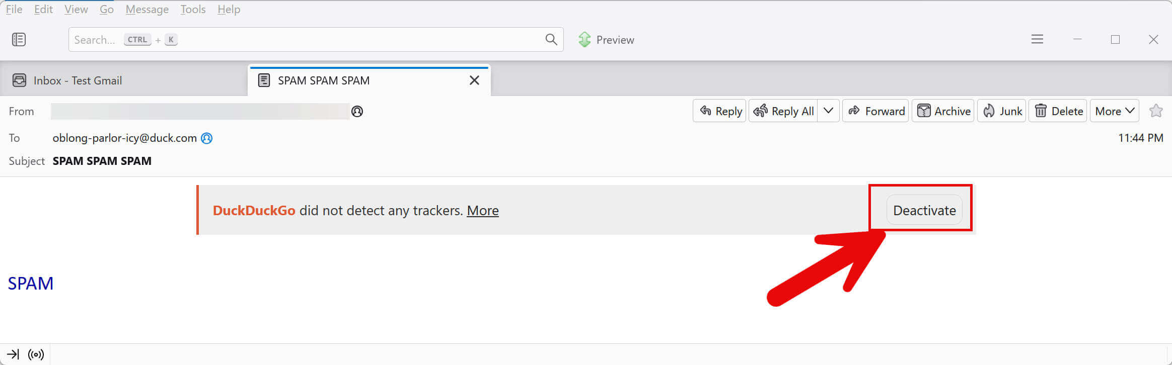 Remember, I cannot delete my main alias address, but I can delete a private alias address. Perhaps I am getting too much SPAM at my oblong-parlor-icy@duck.com address and I want to delete it. To delete the address, I need to deactivate it. At the beginning of every masked email message DDG forwards to my main address, there is a box. In the box, there is a Deactivate button. Click this button and DDG will deactivate the email alias address. DDG will open a page in your browser stating this. DDG will also give you the option to reactivate the address in case you deactivate it by mistake.