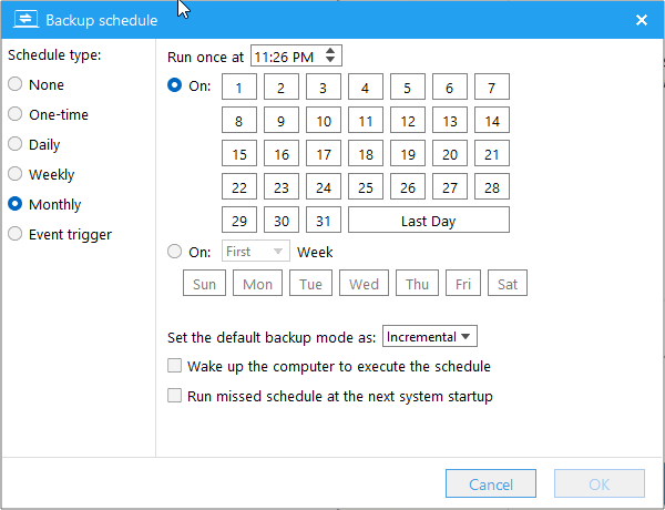 Different types of backups (Full, Incremental, or Differential) can be scheduled to take place on a daily, weekly, monthly, or even based on an event. One interesting event trigger is USB drive is plugged in. If your target disk is a USB device, the defined operation will not occur until that device is seen through the event. This allows a task to be set up to image your system on an external USB device and automatically do an update each time that USB device is plugged into the system with a once-a-day limit option. A convenient and useful way to back up the system if you are using an external device.