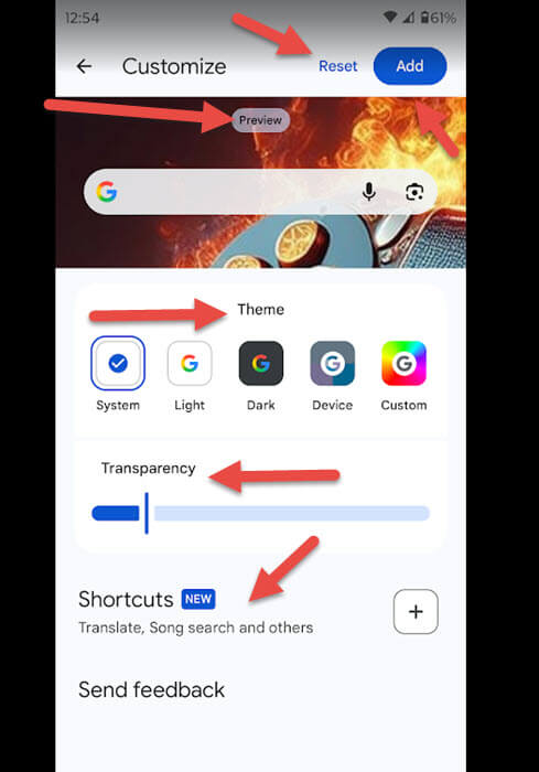 Step 4: On the Settings menu, look for Customize Search widget. Tap it.