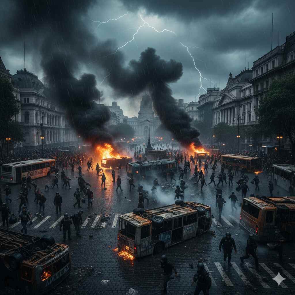 Buenos Aires has been known to resemble this scene, especially back in 2001. But buses with wheels both above and below would certainly be a novelty!