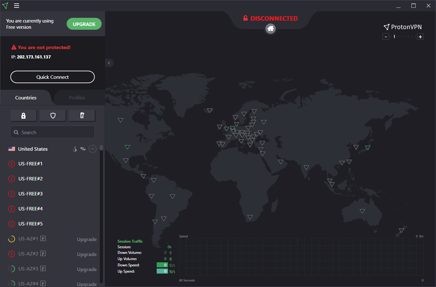 NOTE: ProtonVPN Free does include a Kill Switch to ensure you are not exposed if the connection drops out, but it is not on by default. Click the little icon on the right, under Countries, to enable the Kill Switch: